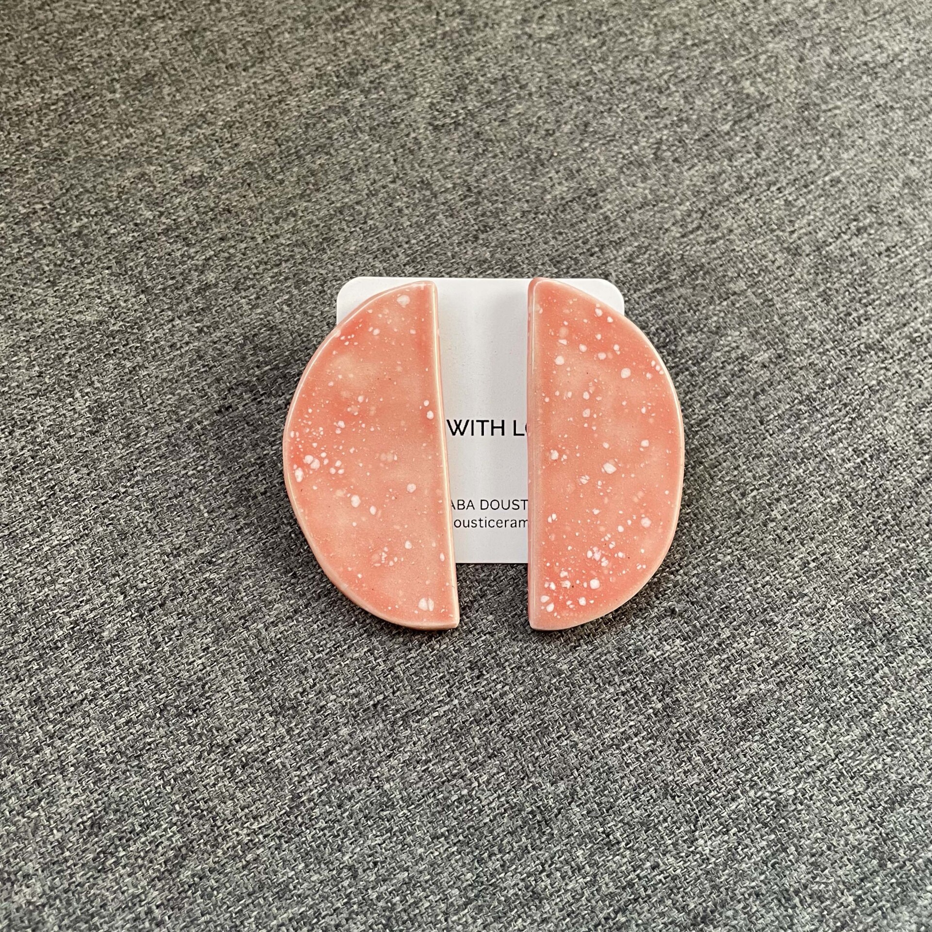 ماهپاره گوشوارهای سرامیکی با رنگ مرجانی و لکه های ظریف، ترکیبی از جسارت و لطافت را در طراحی مینیمال به تصویر میکشد.