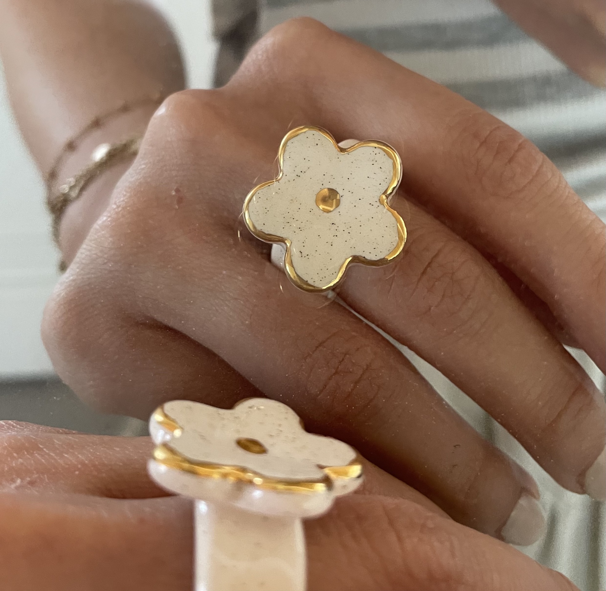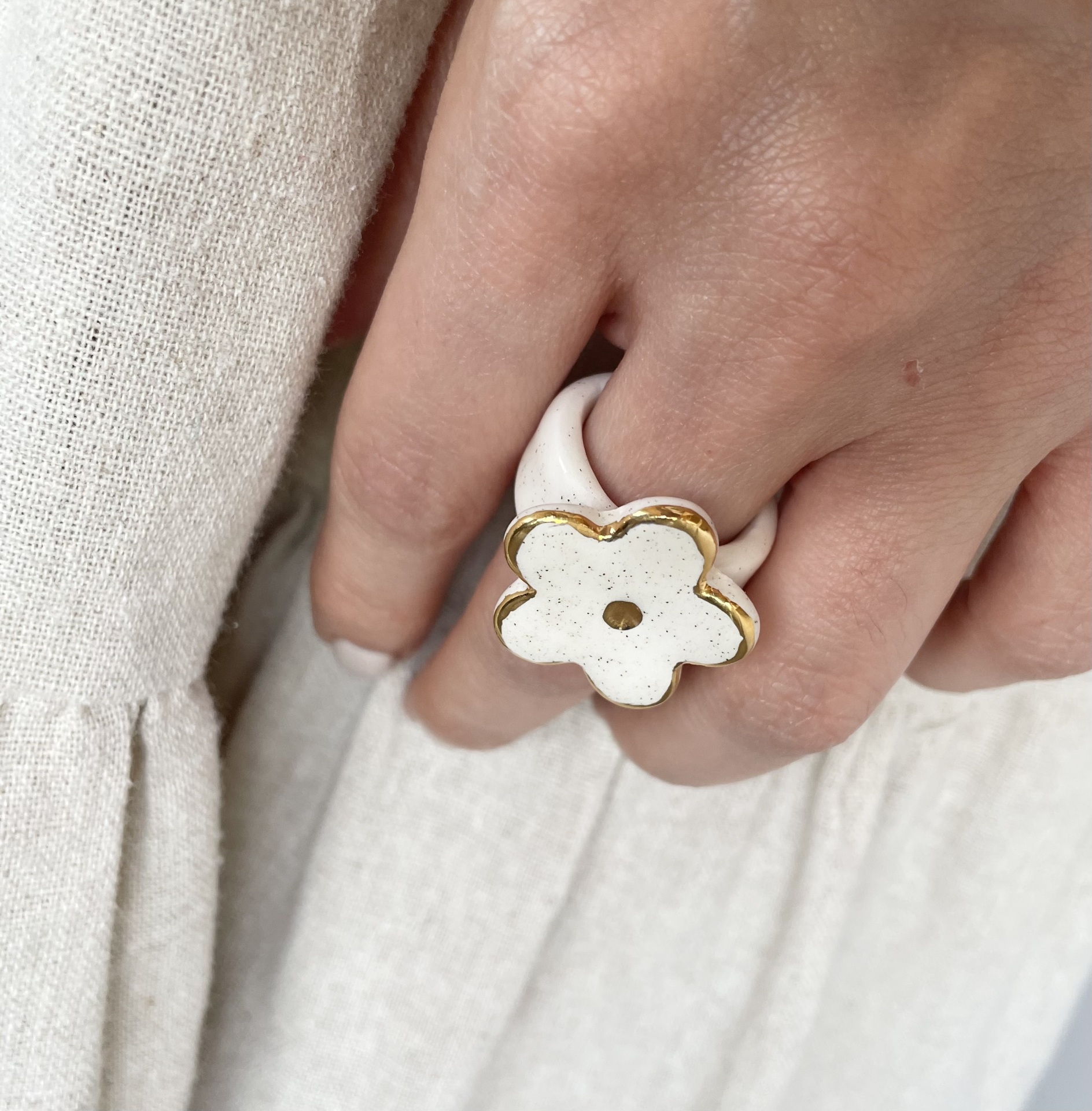 انگشتر سرامیکی فلور، با لاستر طلایی که دارد برق و جلوه زیبایی به دستانتان میدهد.