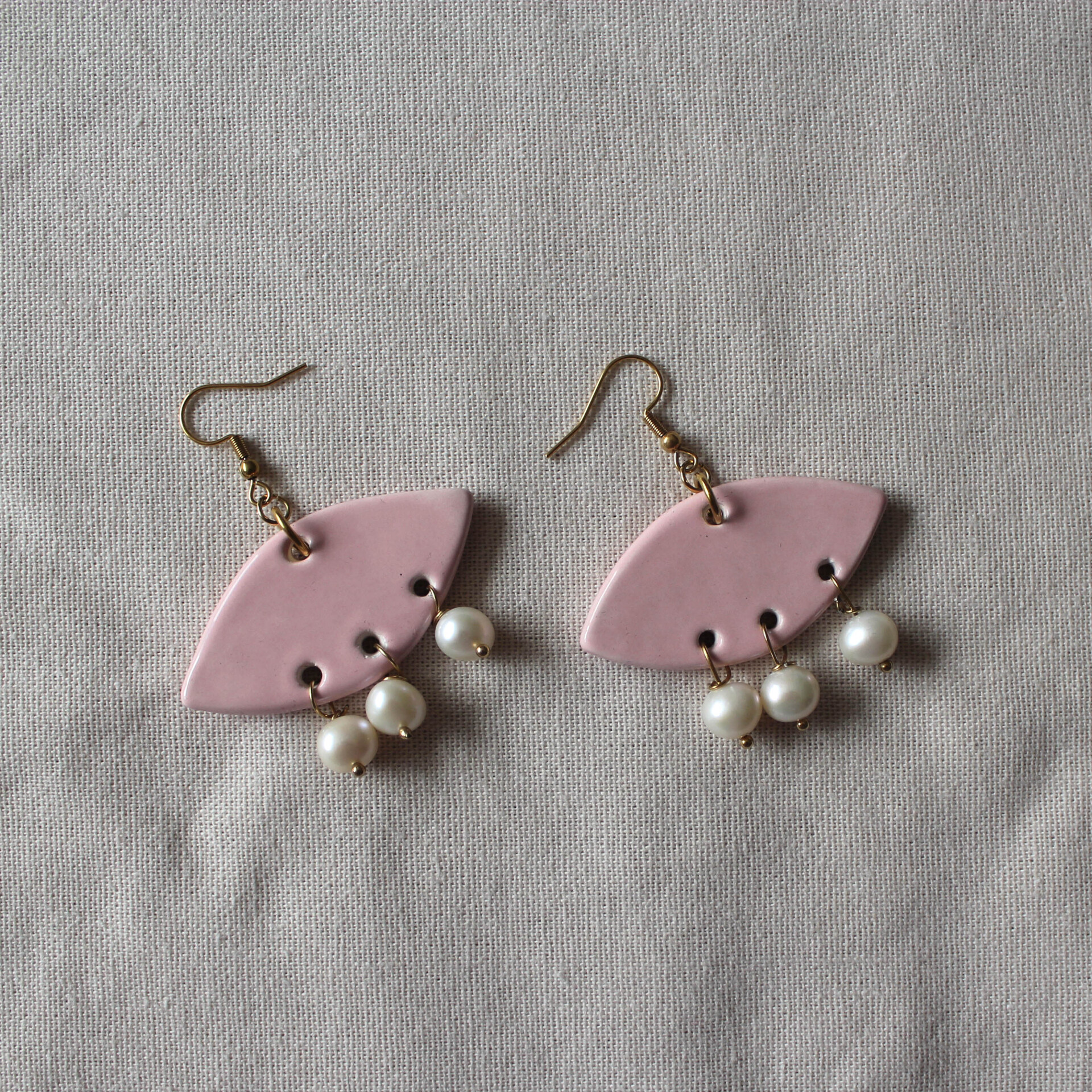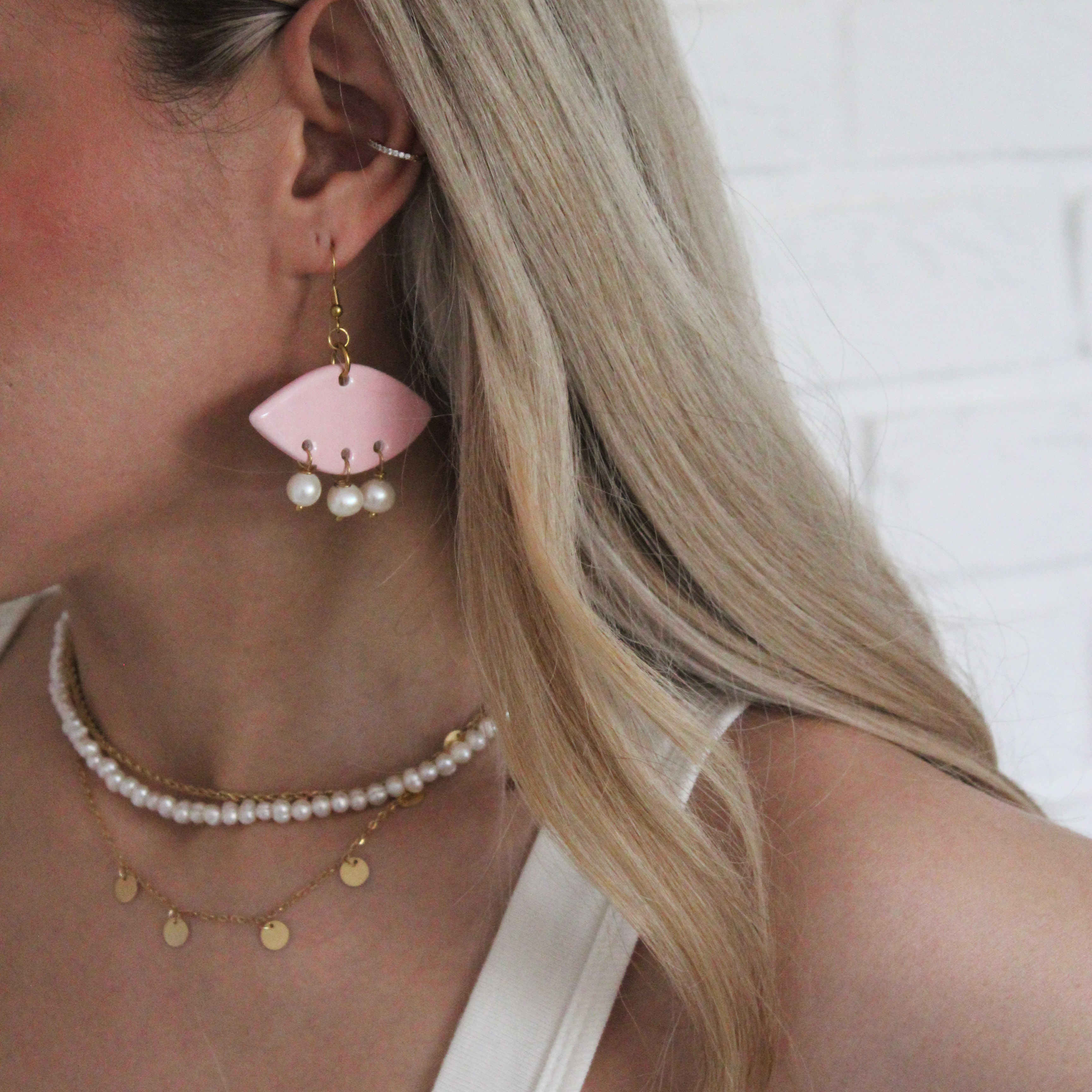 گوشوارهی «چشم صورتی» با لعاب براق سرامیک و آویزهای مرواریدی، انتخابی سبک و درخشان برای استایلهای روزمره و خاص.