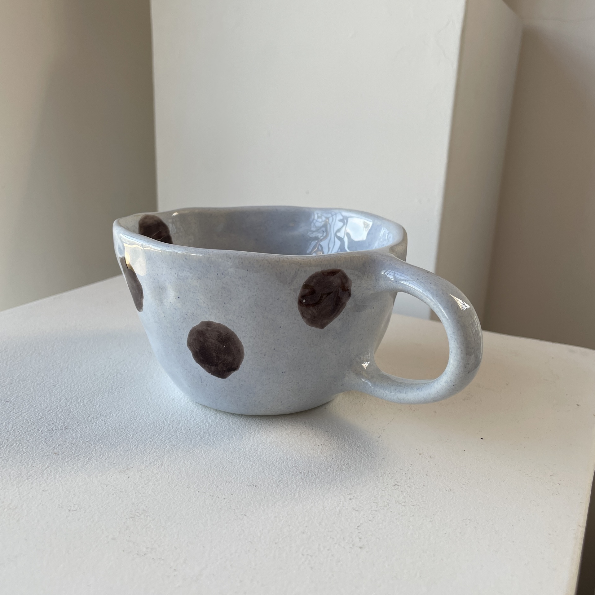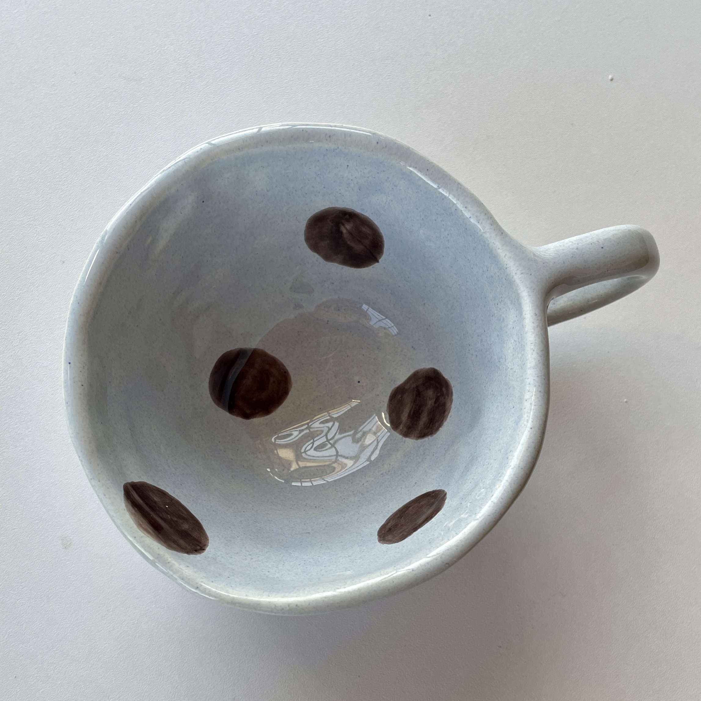 فنجان لاته نقطه با ترکیب رنگ جذاب آبی زمستانی و دایرههای قهوهای مناسب برای لاتههای زمستانی و حتی سوپ و صبحانههای گرم شما